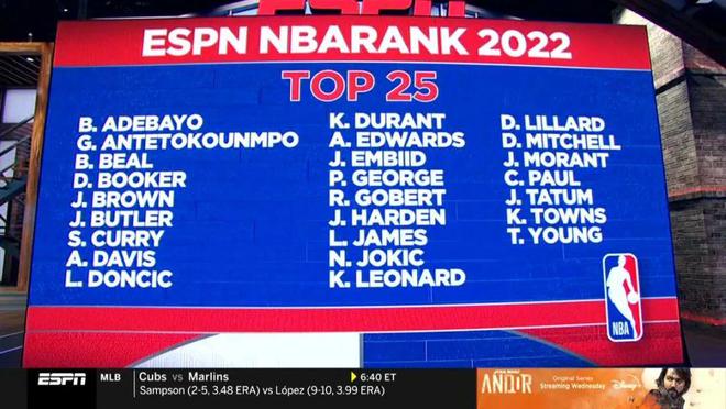 前25名的球员包括:阿德巴约、字母哥、比尔、布克、杰伦-布朗、巴特勒、库里、安东尼-戴维斯、东契奇、杜兰特、安东尼-爱德华兹、恩比德、乔治、戈伯特、哈登、詹姆斯、约基奇、莱昂纳德、利拉德、米切尔、莫兰特、保罗、塔图姆、唐斯、特雷-杨。