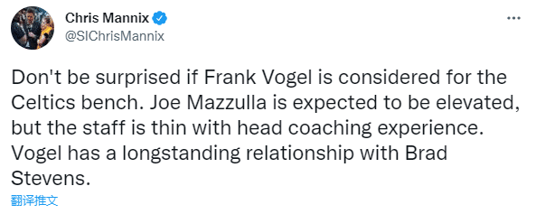 另外《体育画报》记者Chris Mannix表示前湖人主帅沃格尔可能担任绿军临时主帅,他发推写道:若沃格尔成绿军的代理主帅候选,请不要感到惊讶。乔-马祖拉(绿军助教)预计会被重用,但他毕竟主帅经验不足,教练组人数也会不足。沃格尔与史蒂文斯保持着良好的私交。