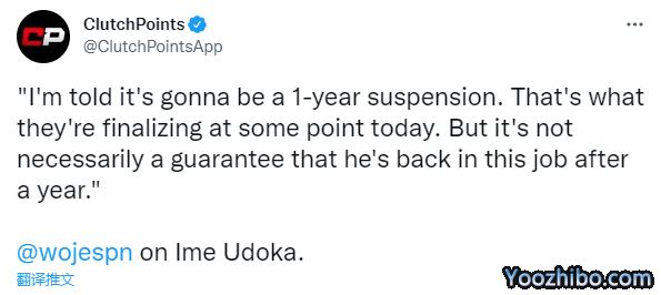 名记woj最新报道,他在节目中表示:我被告知乌度卡将被停职一年,这就是他们今天的最终决定;但这并不一定能保证一年后他会重新执教球队。