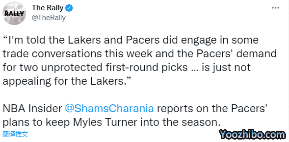 来源:JRS低调看直播09-22 10:08JRS低调看直播09月22日,湖人与步行者交易谈判失败,迈尔斯-特纳新赛季留守步行者;名记shams曝光谈判失败内幕,湖人拒绝送走两个首轮签,预计湖人保守进入新赛季;另外湖人有望很快引援神射博扬。