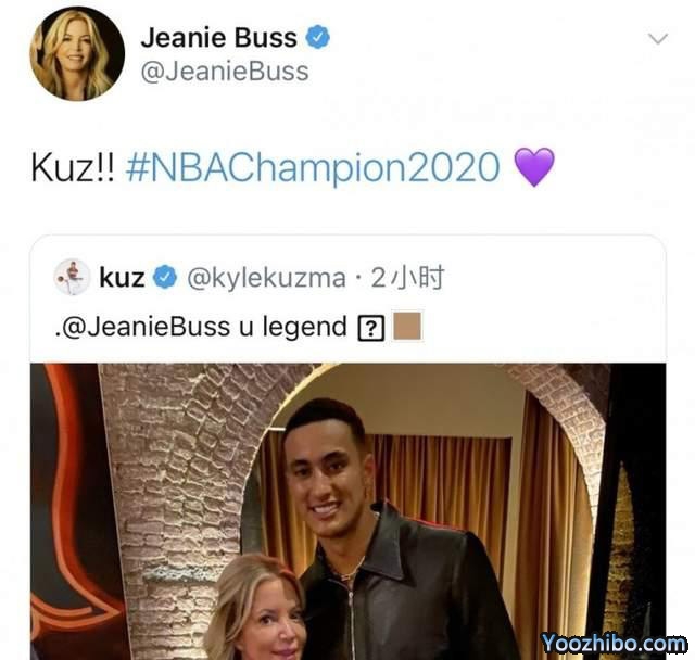 来源:JRS低调看直播09-18 15:22JRS低调看直播09月18日众所周知湖人是目前NBA市值排名前几的球队,但湖人的现任老板珍妮-巴斯却是NBA这么多老板中资产倒数前几的人,那是因为巴斯家族只对湖人拥有运营权,而真正股份却很少。不过这并不影响珍妮阿姨在球迷们心中的地位,近日珍妮阿姨也是更新了自己的社交媒体动态,她转发了前湖人球员库兹马的一条动态,而动态的内容就是他们两人相拥在一起的合照。珍妮还配文:库兹马!2020年总冠军。