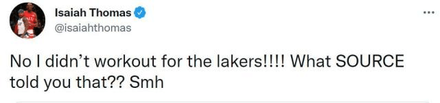 来源:JRS低调看直播09-18 11:00JRS低调看直播09月18日据NBA名记Michael Scotto报道,湖人试训了多位自由球员,其中包括沙巴兹-穆罕默德、杰里米-兰姆、德维恩-培根、米耶-奥尼、小托马斯、阿莫尼-布鲁克斯、沙里夫-库珀和米查尔-穆尔德。毫无疑问,两届全明星小托马斯是名气最大的球员,穆尔德是勇士旧将,兰姆的实力也很出色。小托马斯第一时间辟谣,表示自己并未为湖人试训。他写道:“不,我没有为湖人试训!!!哪个消息源告诉你的?”