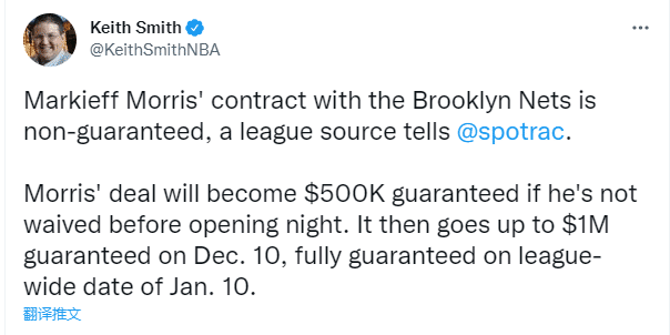 据名记Keith Smith报道,马基夫-莫里斯与篮网签下的是完全无保障合同,如果莫里斯在赛季揭幕前没有被裁掉,他的合同将获得50万美元保障,然后在12月11日保障金额将达到100万美元,在1月11日后变为完全保障。