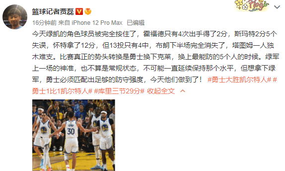 赛后知名篮球记者贾磊点出了勇士获胜的关键和转折点,就是克莱下场之后,他表示:“今天绿凯的角色球员被完全按住了,霍福德只有4次出手得了2分,斯玛特2分5个失误,怀特拿了12分,但13投只有4中,布朗下半场完全消失了,塔图姆一人独木难支。比赛真正的势头转换是勇士换下克莱,换上最能防的5个人的时候。绿军上一场的神准,也不算是常规状态,不可能一直延续保持那个水平,但想拿下绿军,勇士必须匹配出足够的防守强度,今天他们做到了!”