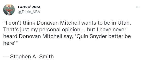 对于米切尔的情况,名嘴“美国杨毅”A-史密斯在节目中表示:我认为米切尔不想留在犹他,这仅仅只是我的个人观点,但我从未听米切尔说“斯奈德最好留在这儿”。