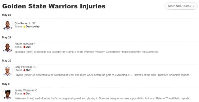 来源:JRS低调看直播05-26 16:14JRS低调看直播05月26日讯 ,勇士和独行侠将在明天迎来G5大战,最新伤情已经出炉。独行侠一方还是老样子,小哈达威因左脚手术继续缺阵,勇士一方,除了确定缺席的小佩顿(左肘骨折)、伊戈达拉(颈椎伤病)、怀斯曼(右膝伤病),波特处于每日观察的状态,出战成疑。