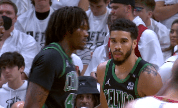 今天的比赛凯尔特人的防守大将斯玛特迎来了复出,在G3的比赛里斯玛特遭遇到了90度的扭伤,最终缺席了G4的比赛,本场比赛斯玛特带伤复出,凯尔特人首发阵容:斯玛特,杰伦-布朗,塔图姆,霍福德,罗威,热火首发阵容:洛瑞,斯特鲁斯,巴特勒,塔克,阿德巴约。赛前记者采访的时候,热火球迷认为主队主场会拿下这场比赛,并且赢下最终的系列赛。