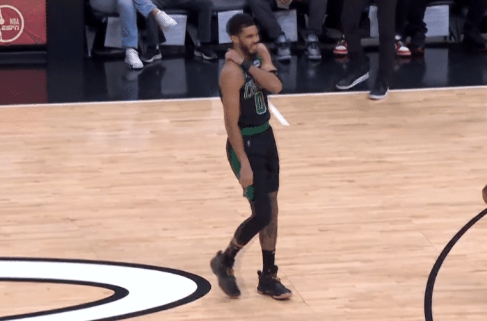 第二节,塔图姆外线三分继续打铁,突破上篮惨遭篮筐无情拒绝,8分07秒塔图姆终于投进三分,热火立即回应,两队打得僵持不下,期间塔图姆传球失误以及撞倒马丁吃到进攻犯规,塔图姆又捂着右肩十分痛苦,受到肩伤的困扰,单节4中1仅3分,半场9中1仅4分以及4篮板5助攻,半场结束时不满判罚,向裁判伸腿抱怨。