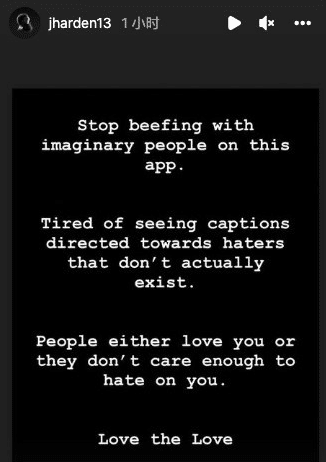 后期哈登看到有不少人恶意中伤自己,晒出了一张图片,内容是:“停止在这个app上和一些虚构的人争论,厌倦看到针对那些并不存在的黑子的言论,人们要嘛爱你,要嘛不在乎你,憎恨你。爱那些爱我的人。”
