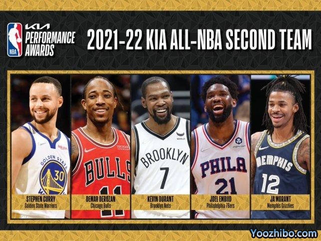 最佳二阵:杜兰特、恩比德、莫兰特、库里和德罗赞