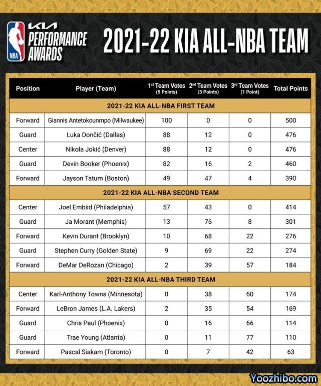 来源:JRS低调看直播05-25 10:25JRS低调看直播05月25日讯 ,NBA官方公布了年度最佳阵容的名单。入选一阵的是东契奇、布克、塔图姆、字母哥和约基奇;入选二阵的是莫兰特、库里、杜兰特、德罗赞和恩比德;入选三阵的是保罗、特雷-杨、詹姆斯、西亚卡姆、唐斯。字母哥是唯一一位全票入选一阵的球员!