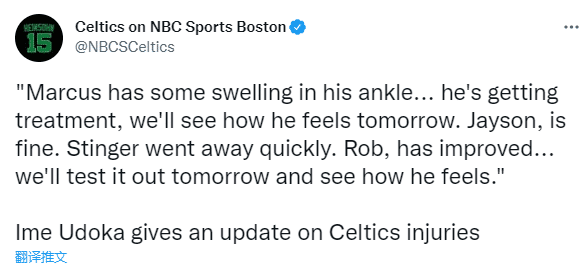 今日接受采访时,凯尔特人主帅乌度卡更新球队伤情,表示斯玛特脚踝扭的挺严重的,目前有肿胀情况,他正在接受治疗,我们会在明天看看他感受如何。