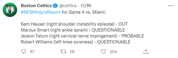 凯尔特人官方东决G4伤情报告,萨姆-豪瑟(右肩伤势)继续缺席比赛,斯玛特(右脚踝扭伤)和罗威(左膝酸痛)都被列为出战成疑,50%可能性出战;塔图姆(右侧颈部神经压迫症状)被列为大概率出战,75%可能性。
