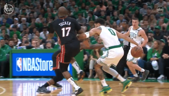 来源:JRS低调看直播05-22 11:49JRS低调看直播05月22日讯 ,NBA季后赛东部决赛第三场,热火上半场打爆凯尔特人,塔克假摔引热议,第三节场上伤病不断,巴特勒因伤退赛,斯玛特90度崴脚后被搀扶离场。