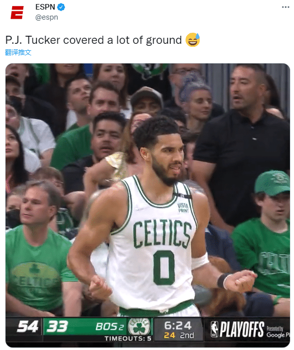 第二节,塔图姆在进攻时推倒PJ-塔克,这球吹罚进攻犯规没问题,不过塔克夸张的假摔表演冲上热搜引热议,37岁塔克像冰壶似的,从三分线外摔倒并且滑出底线。