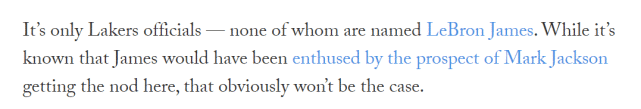 这也意味着只有马克-杰克逊是彻底没戏的状态。查拉尼亚报道称,由佩林卡领导的湖人高管组成委员会决定教练人选,而参与决策的没有詹姆斯。珍妮计划听从委员会建议。众所周知,詹姆斯最希望马克-杰克逊出任湖人主帅,还曾经对他的前景感到兴奋,但马克-杰克逊没有入围最终候选名单,已经说明了湖人的态度。另外,所有候选人都被要求谈论威少的使用问题,这也意味着湖人做好留下威少的准备了。