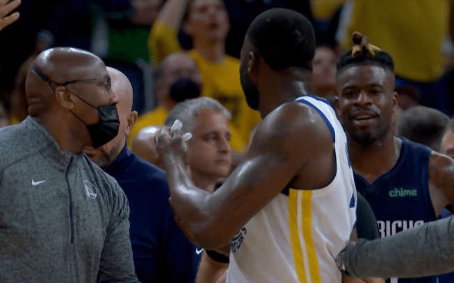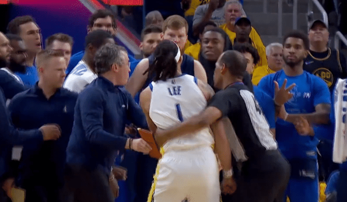 第二节8分03秒,贝尔坦斯迎着达米安-李投进三分,但失衡摔倒,防守他的达米恩-李恰好从贝尔坦斯身上跨过,后者非常不满直接起身顶翻李,双方发生争吵冲突,妹夫指着贝尔坦斯喷垃圾话,裁判第一时间搂住妹夫,之后普尔和格林为队友出头,回放之后裁判吹罚了贝尔坦斯和妹夫双双技术犯规,格林逃过一劫。
