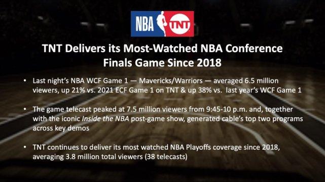 来源:JRS低调看直播05-20 14:43JRS低调看直播05月20日讯,TNT公布了西决首战的收视率。据报道,这场比赛的平均收视人数为650万人,比2021年的东决G1提升21%,比去年的西决G1提升38%。当地时间晚上9点45分至10点,收视人数来到最高的750万人,该场比赛与之后的《Inside the NBA》节目一起成为了当日有线电视频道中收视率最高的两档节目。