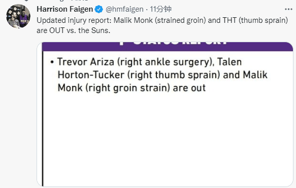 来源:JRS低调看直播10-10 11:11JRS低调看直播10月10日讯 ,洛杉矶湖人队最新伤病报告出炉,据名记Harrison Faigen报道,明天对阵太阳,除了阿里扎(右脚踝清创手术)之外,塔克和蒙克也将缺席本场比赛,塔克遭遇右手拇指扭伤,蒙克则是遭遇右腹股沟拉伤。
