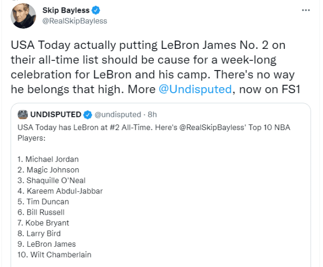 来源:JRS低调看直播10-09 16:52JRS低调看直播10月09日讯 ,NBA知名评论员斯基普-贝勒斯在节目上谈论《今日美国》的75大巨星排名。《今日美国》将詹姆斯排在历史第二,仅次于乔丹,而贝勒斯公布了自己心中的前十排名,詹姆斯竟然只被他放在第九。