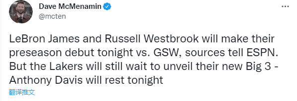 来源:JRS低调看直播10-09 16:37JRS低调看直播10月09日讯 ,湖人两大巨头詹姆斯和威少确定出战勇士,湖人记者Dave McMenamin他俩都会参加今天的比赛;此前詹姆斯和威少已经连续轮休两场,而今天湖人对阵勇士,詹姆斯将迎来湖人6号生涯首秀,威少则是迎来紫金生涯首秀,但浓眉轮休,湖人三巨头合体还需等待。