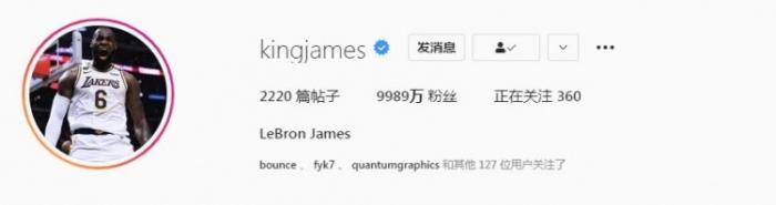 另外据美媒Front Office Sports统计,詹姆斯ins的粉丝超过五大联盟官方账号粉丝之和,截至目前,詹姆斯的ins粉丝为9989万,而NBA、NFL、MLS、MLB和NHL的粉丝之和为9630万。这是何等恐怖的事情,这说明了一个人的影响力有多可怕,1亿人啊,全球有多少国家的人口超过了1亿呢?有这么多人去关注他!