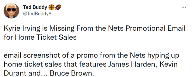 来源:JRS低调看直播10-08 16:48JRS低调看直播10月08日讯 ,据篮网球迷表示,在他们最新收到的球队邮件中,售票海报上已经没有欧文的照片,上面有三位球员的形象,分别是哈登、杜兰特和布鲁斯-布朗。显然,篮网用布朗顶替了那个原本应该属于欧文的位置。