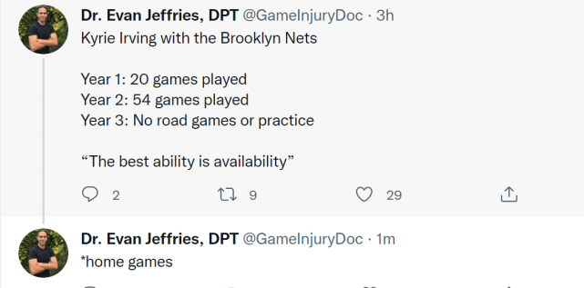 他晒出了欧文加入篮网后的出勤表现。第一个赛季,只打了20场比赛;第二个赛季,只打了54场比赛;第三个赛季,若不接种疫苗,预计将缺席全部主场比赛和训练。专家感慨道:“出勤是最好的能力。”