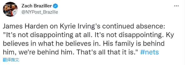 此前杜兰特回应欧文因拒绝接种而缺席的话题,表示他没有和欧文谈过这件事,真心地希望欧文能够成为球队的一部分;不久前哈登也回应此事:这并不令人失望,欧文有只的信仰,他的家人支持他,我们也支持他,仅此而已。