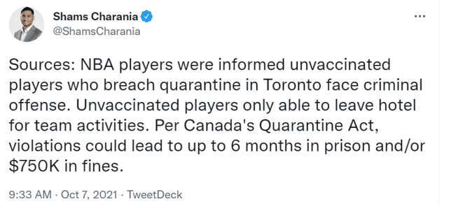 来源:JRS低调看直播10-07 16:58JRS低调看直播10月07日讯,据名记查拉尼亚报道,加拿大的防疫规定非常严格,在多伦多打球时,未接种疫苗的NBA球员只能在参加球队集体活动时,才会被允许离开酒店。如果球员违反规定,私自离开酒店,将被处于最高6个月的监禁以及75万美元的罚款。