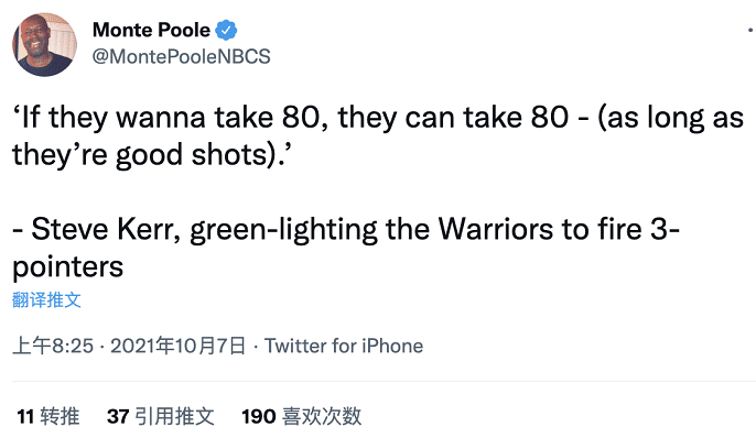 虽然科尔给开了绿灯,但作为一名严谨的主帅,科尔指出了非常关键的一点,那就是得在好的投篮选择下才可以,不能说为了投三分球而去出手,要在进攻端中找到合适的投篮位置和机会,这样的前提条件下才允许让球员们进行。