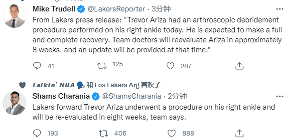 此前阿里扎因脚踝酸痛缺席了大部分的训练营,并且连续缺席两场季前赛,如今阿里扎成功接受右脚踝关节镜清创手术,至少伤停8周,将缺席一部分的常规赛;湖人新赛季揭幕战将在10月20开打,也就是再过13天,而阿里扎至少伤停两个月,但愿阿里扎早日痊愈归队。