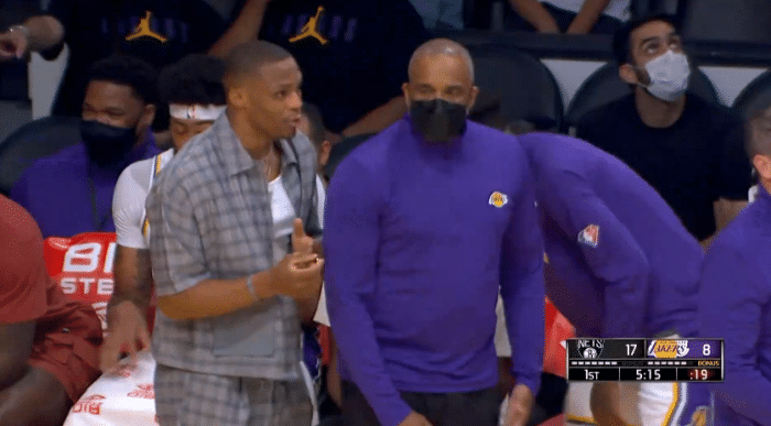 来源:JRS低调看直播10-04 10:57JRS低调看直播10月04日讯 NBA季前赛揭幕战正式打响,湖人主场97-123不敌篮网,詹姆斯、威少、杜兰特、哈登和欧文等球星都是高挂免战牌,他们都是身穿便装坐在场边观战;比赛期间,湖人场边暖心一幕曝光,威少主动为浓眉让座,然后詹眉并肩坐在一起。