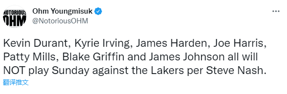 篮网主帅纳什透露,凯文-杜兰特、凯里-欧文、詹姆斯-哈登、乔-哈里斯、帕蒂-米尔斯、布雷克-格里芬以及詹姆斯-约翰逊都不会出战首场对阵湖人的季前赛;篮网三巨头领衔,多达7人缺席首战湖人,很明显篮网的季前赛计划也是以练兵为主,为常规赛养精蓄锐。