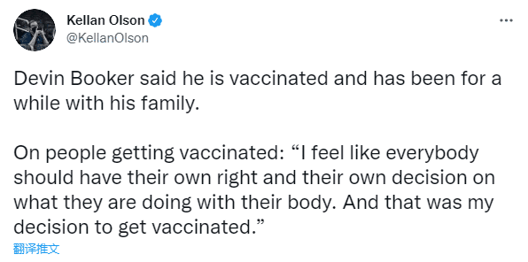 此前布克因感染新冠被隔离,缺席了太阳队媒体日和训练营开始阶段,如今布克已经解除隔离,并且归队参加训练;训练之后,布克直言他已经接种疫苗,他表示:我觉得每个人都应该有自己的权利,对自己的身体做什么有自己的决定,这就是我接种疫苗的决定。