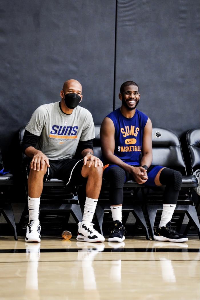 布克归队的心情都写在脸上,抱着球满脸笑容,和保罗坐在场边有说有笑;保罗和太阳主帅蒙蒂-威廉姆斯也是一脸笑容,其中保罗左手腕上戴着护具,今年休赛期,保罗接受了左手腕手术,训练营期间仍旧戴着护腕。