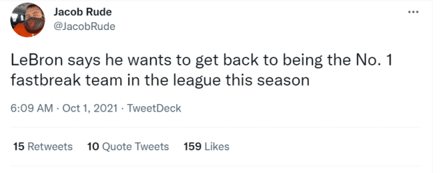 来源:JRS低调看直播10-01 14:33JRS低调看直播讯 北京时间10月1日,湖人迎来训练营的第二天,詹姆斯在采访中强调快攻的重要性。“我们想要回到快攻第一的位置。我觉得我们这个赛季的阵容,最强的能力就是可以跑起来。显然,拉斯(威斯布鲁克)一直是联盟前五的节奏,这一点可以成为我们的优势,有利于我们的整体进攻。”