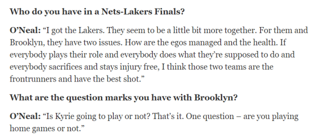 奥尼尔说:“我选择湖人,他们看上去更团结一些。篮网有两个问题,如何控制自我以及健康问题。如果每个人都扮演好自己的惧色,每个人都做到该做的事,而且没有伤病的困扰,我认为这两支球队是总冠军领跑者,他们都有最好的机会。”当谈到篮网可能存在的麻烦时,奥尼尔说:“欧文到底会不会打主场比赛,就是这样。”