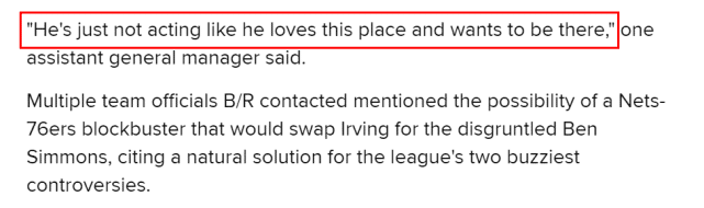 即便如此,欧文仍不愿意接种疫苗,这引起了圈内人士的猜测。一支球队的副总经理在接受B/R采访时说道:“他(欧文)并没有表现出自己爱这个地方,而且想要留下来。”B/R采访的多支球队高层,都提到了篮网和76人交易的潜在可能性,欧文和西蒙斯互换东家,对于两支身处舆论中心的球队来说,或许是最自然的解决方案。