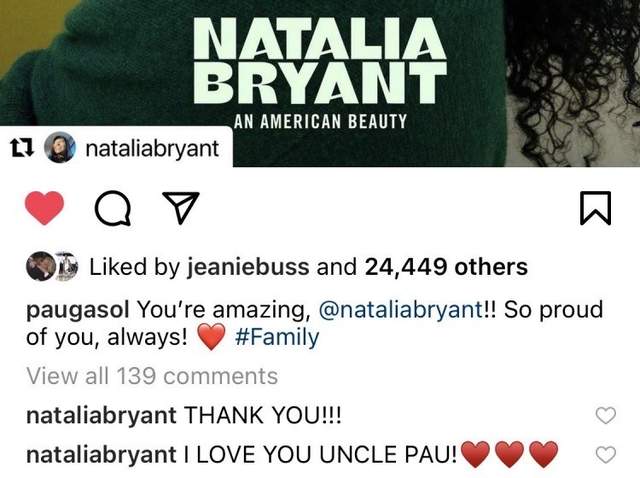 而很多关心科比的球迷们在得知娜塔莉亚成为了杂志封面人物之后也是纷纷发来道贺,一直以来都陪伴在科比妻女身边的大加索尔也是第一时间在社交媒体上恭喜了娜塔莉亚。娜塔莉亚也是回应谢谢保罗叔叔,还送上了一句我爱你。不得不说大加索尔现在和瓦妮莎以及科比的几个女儿都完全融入在一起,他们就像是一家人一样,大加索尔也在很大程度上承担起了科比的职责。