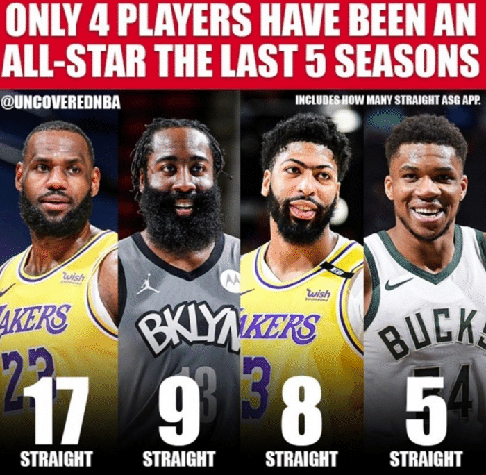 近5年全部入选全明星有多难?全联盟仅4人!杜兰特库里两大超巨无缘