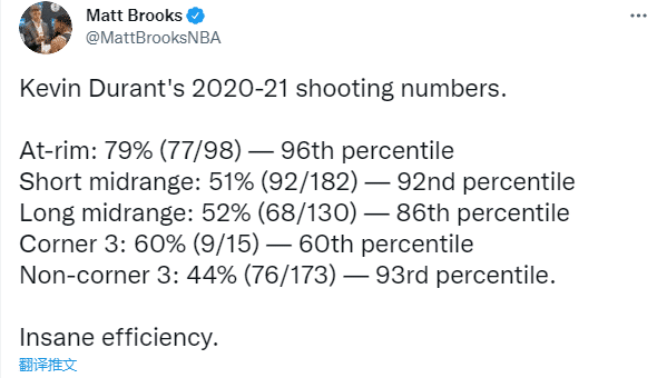 上赛季杜兰特的进攻效率很高,禁区98投77中、命中率79%;短距离中投182投92中、命中率51%;长两分130投68中、命中率52%;底角三分15投9中、命中率60%;非底角三分173投76中、命中率44%;名记Matt Brooks直呼这效率太疯狂了。
