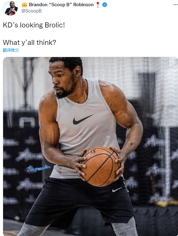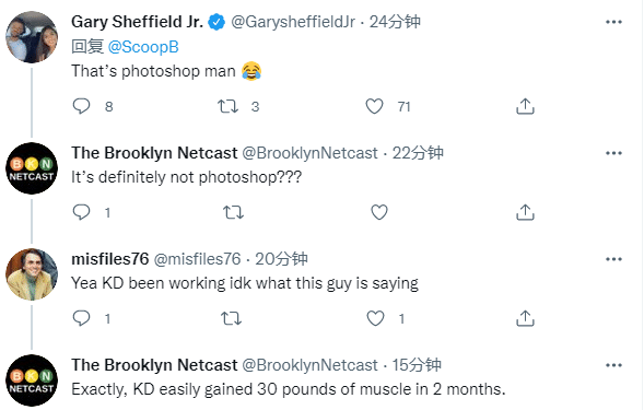 杜兰特身材大变样引热议,推特认证账号Gary Sheffield Jr第一时间评论:这是P照(笑哭表情);篮网球迷发问这真的不是P照吗?并且调侃确切地说,杜兰特在2个月内增加了30磅肌肉(大概27斤)。