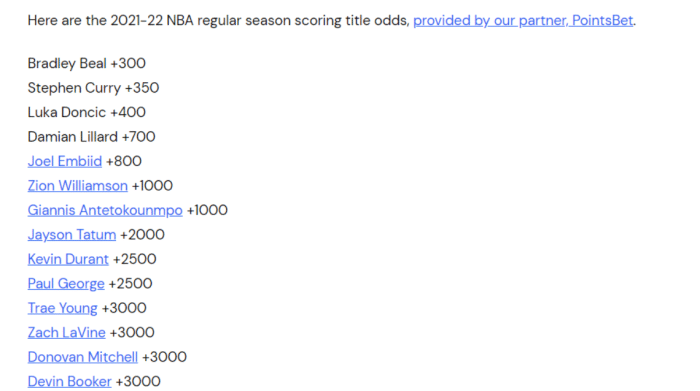 来源:JRS低调看直播09-08 19:28JRS低调看直播9月08日讯新赛季关于总冠军的归属,关于常规赛MVP的归属,都是人们讨论和关注的话题。当然得分王也是大家所为之关注的焦点,那么最新一个赛季,哪名球员最被看好成为得分王呢?新赛季得分王赔率最新出炉,排名第一的是来自奇才的比尔,力压NBA众多球员排在这一榜单第一名,赔率为+300。