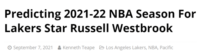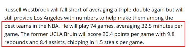 来源:JRS低调看直播09-08 19:23JRS低调看直播9月08日讯湖人新赛季的阵容有很大变化,威少是最受关注的一张新面孔。2021-22赛季,他能在湖人打出怎样的数据呢?北京时间9月8日, 美媒nbaanalysis给出了他们的预测——