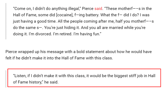 名人堂的典礼将在北京时间9月12日举行,谈到自己此前在社媒上流出的与脱衣舞娘有关的视频是否会影响到评选时,皮尔斯的反应很直接:“拜托,我又没做任何违法的事。我听说名人堂里的这些家伙,有一半做过类似的事情,只是没人关注。特别是他们做这些事是都是已婚状态,我现在是离婚状态,也退役了,我现在过得很开心。听着,如果我没入选名人堂,那将是史上最愚蠢的评选。”这番话中,皮尔斯多次爆粗口。直截了当表达自己的想法,让皮尔斯觉得很痛快。