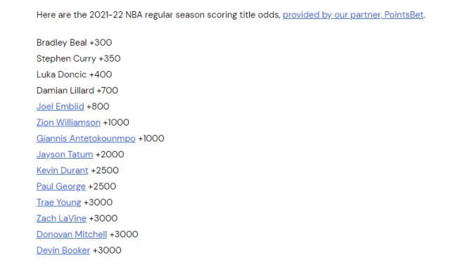新赛季得分王赔率出炉!比尔力压库里居首 杜兰特第9湖人无人上榜