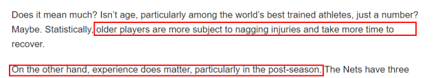 美媒指出年龄和球龄大是双刃剑。一方面,更老的球员更有可能受伤,而且需要更多时间康复。另一方面,在季后赛的舞台上,经验更丰富的球员通常有更好的发挥。本赛季你们更看好谁能夺冠?
