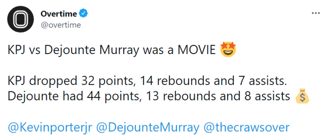 来源:JRS低调看直播07-25 10:22JRS低调看直播讯 北京时间7月25日,火箭队21岁新星小凯文-波特参加西雅图The Crawsover联赛,单场轰下32分14篮板7助攻,他和马刺后卫德章泰-穆雷多次对位,展现了全面的进攻能力。穆雷也在这场比赛中得到44分13篮板8助攻。两人来自同一所西雅图高中,是多年的好友。美媒Overtime感慨两人的对决就如同一部电影。最终,小波特所在的球队112-99获胜。