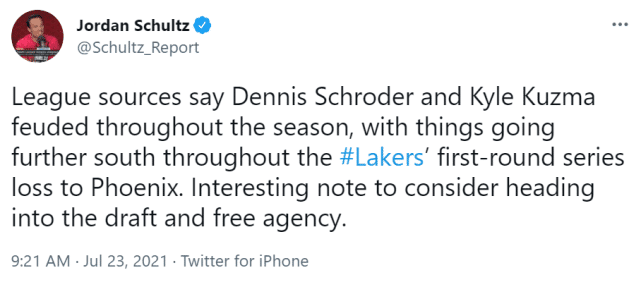来源:JRS低调看直播07-23 11:43JRS低调看直播讯 北京时间7月23日,据ESPN记者Jordan Schultz爆料,联盟消息源透露,湖人球员施罗德和库兹马整个赛季的关系都不好,两人在征战季后赛首轮时关系进一步恶化。Schultz的爆料引起热议,不少球迷建议湖人还是把两个球员都送走,避免影响球队的化学反应。
